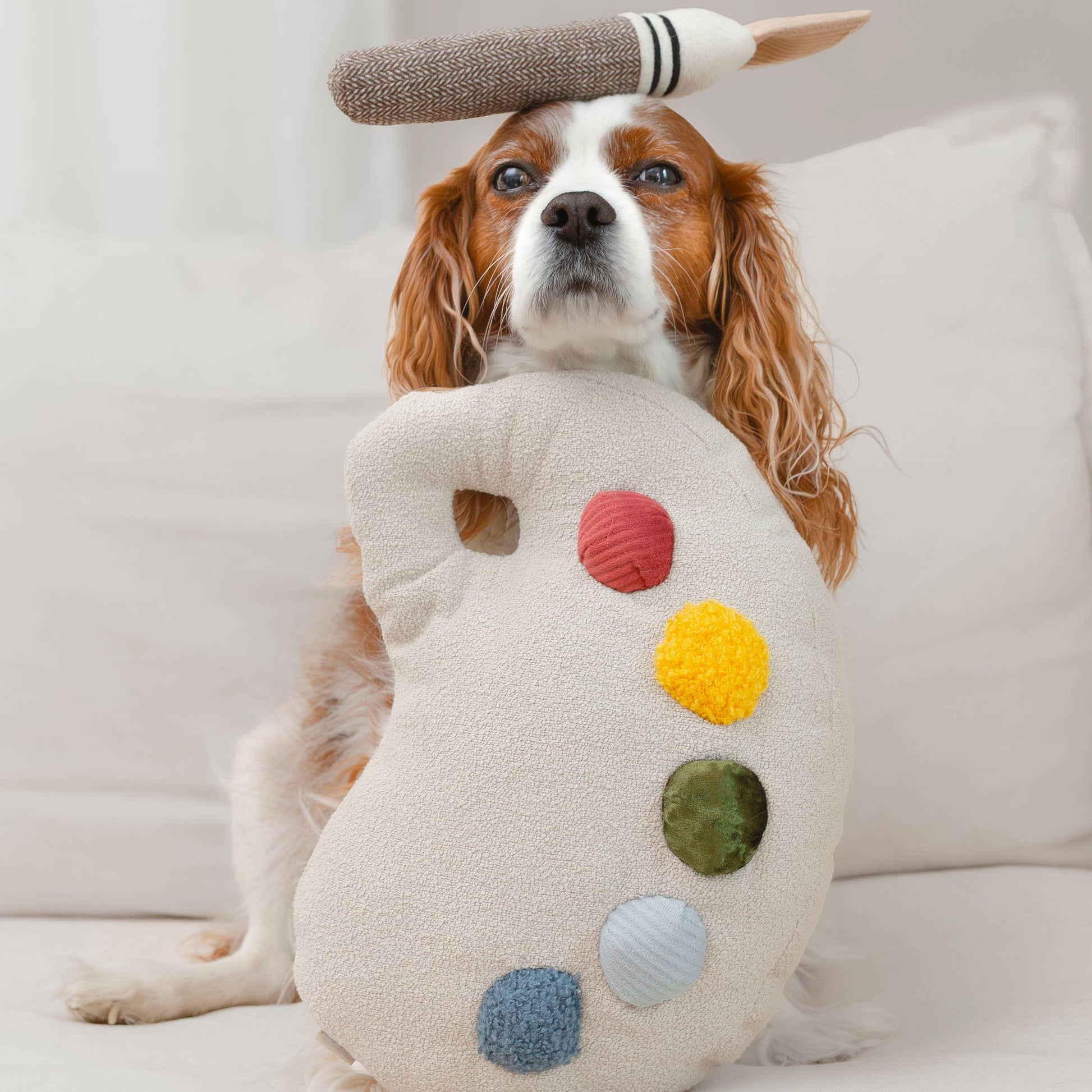 Offrez Ă votre compagnon une expĂ©rience ludique, sensorielle et pleine de style avec notre ensemble Palette de Couleurs, composĂ© dâun coussin en forme de palette douce et dâun pinceau couineur amusant.