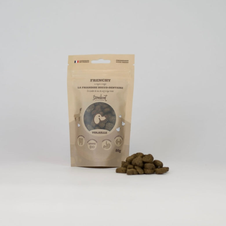 Avec seulement 5 ingrédients, FRENCHY est une collation saine, savoureuse et efficace pour prendre soin des dents de votre chien. Enrichie en poudre de bois de cerf et en algue brune, elle aide à réduire la formation de tartre et à maintenir une haleine fraîche.